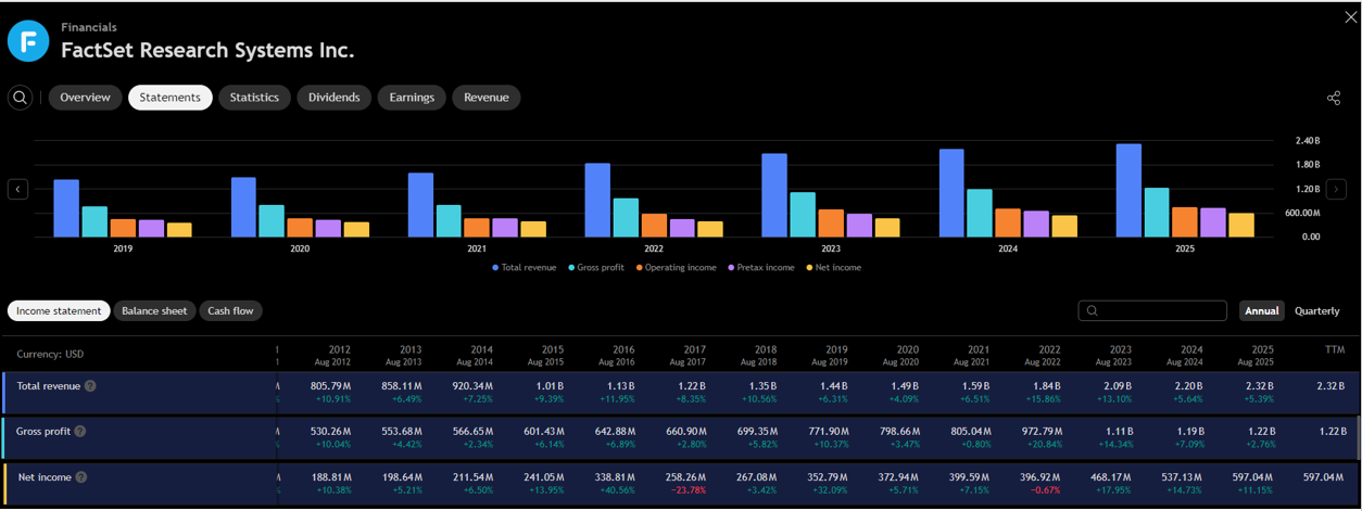 Despite recent volatility, the company has continued to report steady top- and bottom-line growth. Fiscal 2025 results included revenue of $2.32 billion (up 5.4% year-over-year), net income rising to $597 million, and profit margins improving to 26%, with ASV growth of 5.7% reflecting strong client demand across buy-side and wealth verticals.