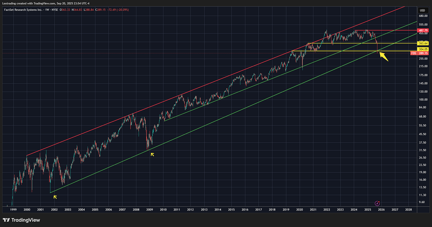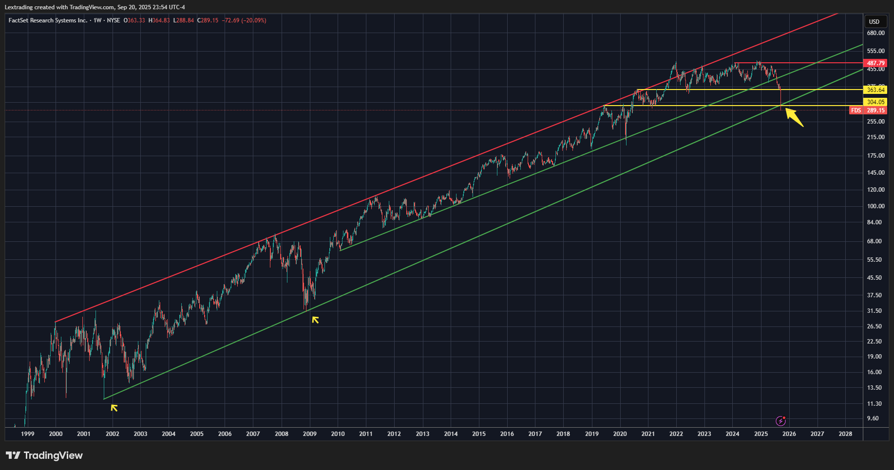 Technical analysis highlights that this correction has pulled FDS back to a major long-term support level that previously attracted substantial institutional buying interest during past bear markets and financial crises.