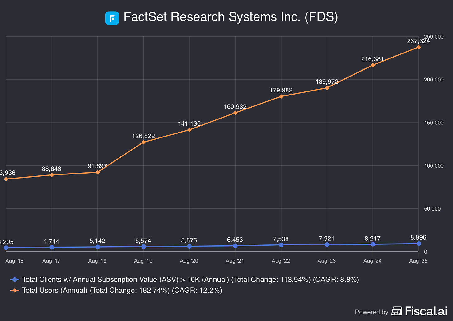 FactSet Research Systems (NYSE: FDS) stands as a premier provider of financial data, analytics, and enterprise software solutions for global investment professionals. The company’s platform demonstrates exceptional stickiness, supported by Annual Subscription Value (ASV) retention above 95% and a strong client retention rate near 91%, underlining deep client integration and significant switching costs that reinforce durable, long-term relationships.