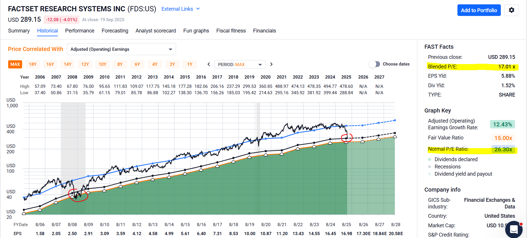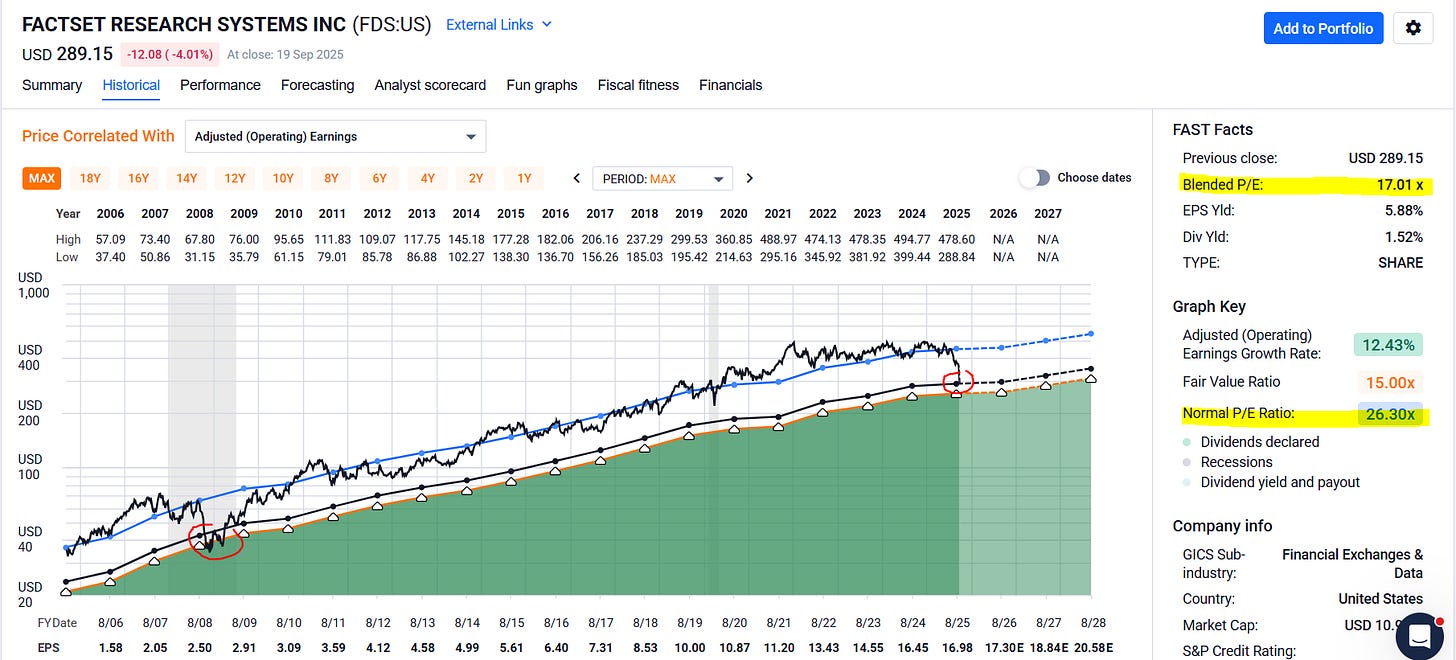 From a valuation perspective, FactSet is presently trading at a price-to-earnings multiple well below its historic average, at levels last observed during the depths of the 2008 downturn, signaling a discounted entry point on a relative basis.
